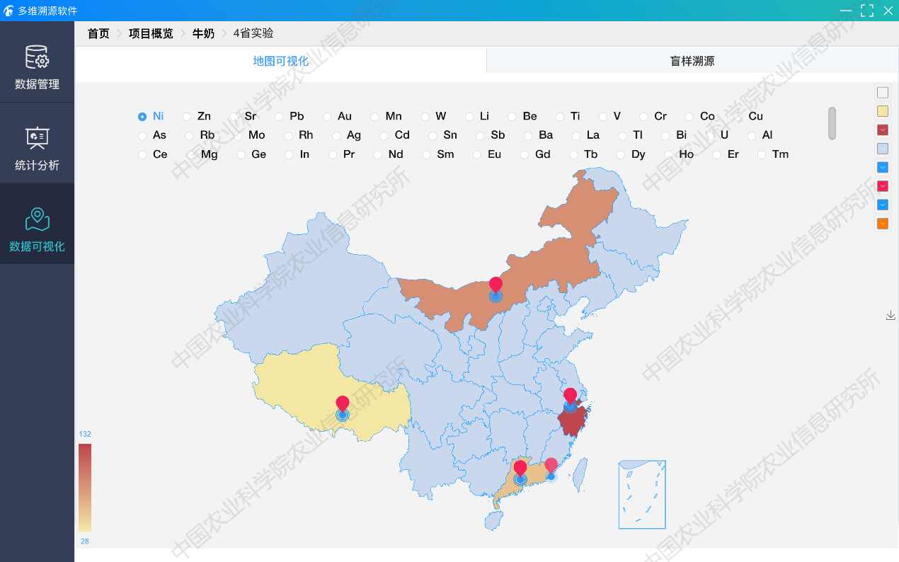 专门为从事动物农产品质量安全研究或管理人员提供产品真伪鉴定和产地溯源服务,针对农产品溯源过程中存在多维异构数据采集、需要多种分析工具、操作不便、无法快速对产地来源或者真伪进行准确识别和定位等问题,通过开发一套集产品数据管理、专业分析和可视化功能于一体的定制化综合服务工具,实现了对动物源农产品稳定同位素、矿物元素、代谢组、DNA、近红外、脂肪酸等各项指标提供主成分分析、层次分析聚类、线性判别、偏最小二乘判等多维度、多方法的专业化计量分析,支持通过傻瓜式的便捷操作帮助质检人员快速获取鉴别报告,显著提高农产品溯源效率和质量。