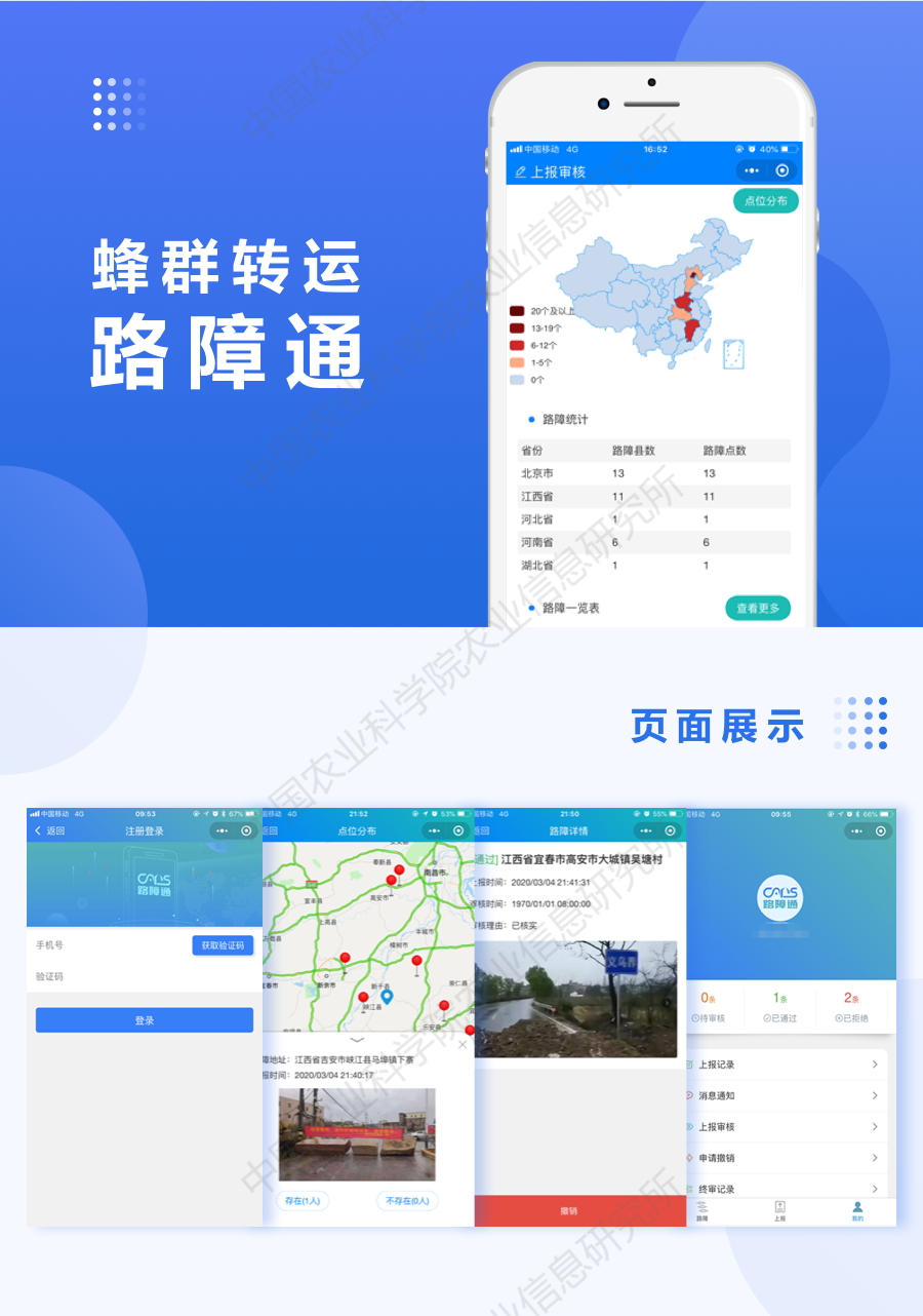 蜂群转运路障通(简称路障通)是受国家蜂产业技术体系委托开发,针对新冠疫情各地封路背景下蜂群运转过程中道路不畅通、转地蜜源场地消息不够明细等困扰蜂农的难题,是一款实用的路障信息上报与可视化管理平台,以微信小程序方式呈现,用作搜集全国各地路障相关信息,助力全国蜂农开展转地放蜂作业。主要功能包括路障信息上报、查阅、审核、发布、撤销等,该平台一方面适合全国各地区、各级路障信息管理人员提供路障信息上报和管理;另一方面便于蜂农等关注路障信息的各产业领域用户及时准确地了解全国路障情况,保障蜂农等产业用户顺利做好蜂群转运等相关工作。