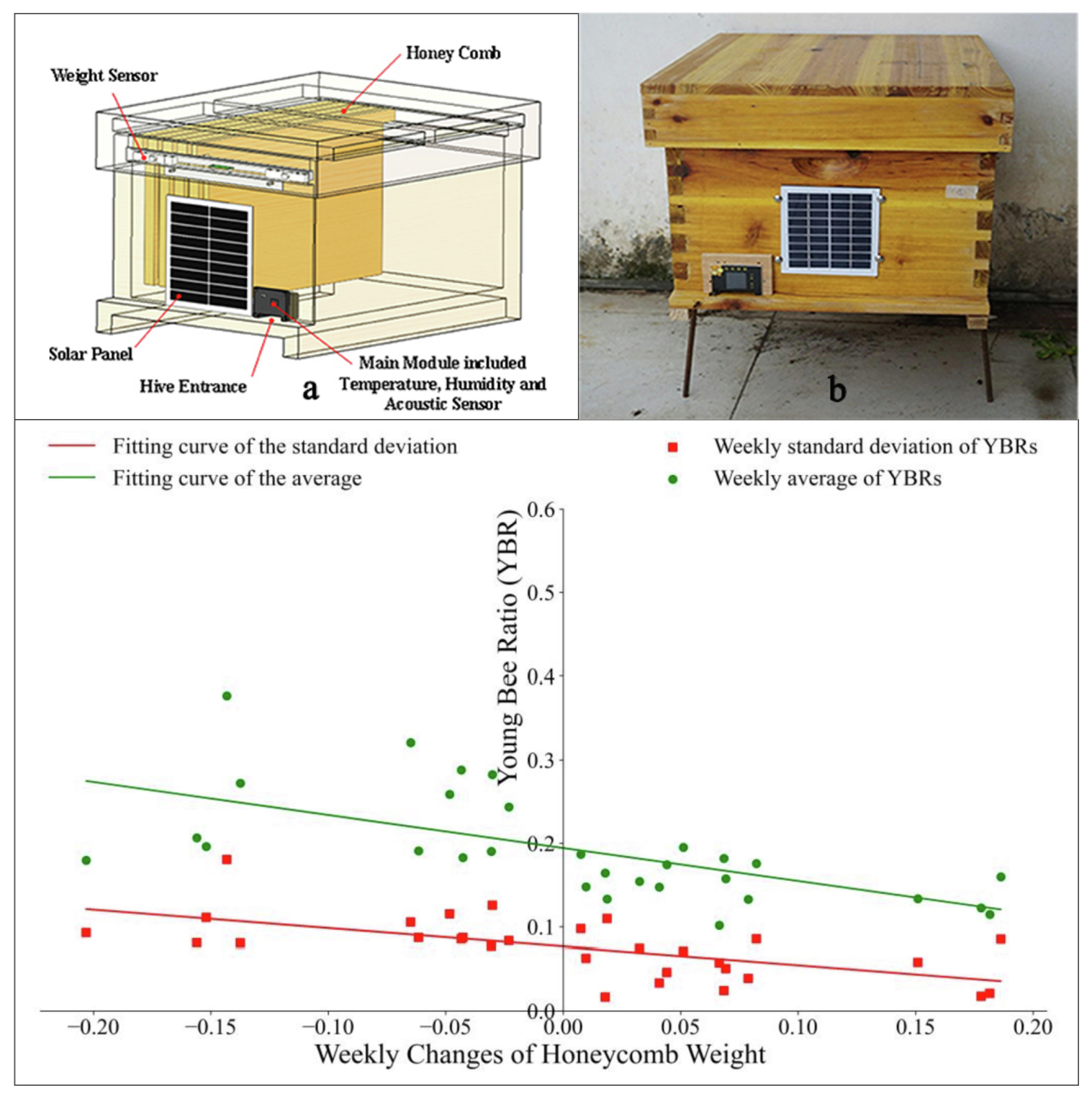 该研究以幼蜂为研究对象,利用自主研发的”智能蜂箱“对蜂群的活动进行了连续监测,这一创新方法不仅为揭示蜂群发展趋势提供了新的视角,也为量化蜂群年龄结构提供了一种非侵入性的观测技术。通过幼蜂比率(YBR)的变化,能够清晰地洞察蜂群发展的趋势。该研究不仅展示了“智能蜂箱”技术在养蜂业中的潜在应用前景,也为研究蜂群崩溃提供了一种可行的方法。通过连续监测幼蜂比率,可以及时发现蜂群发展中的问题,并采取相应的措施进行干预,从而避免蜂群崩溃的发生。