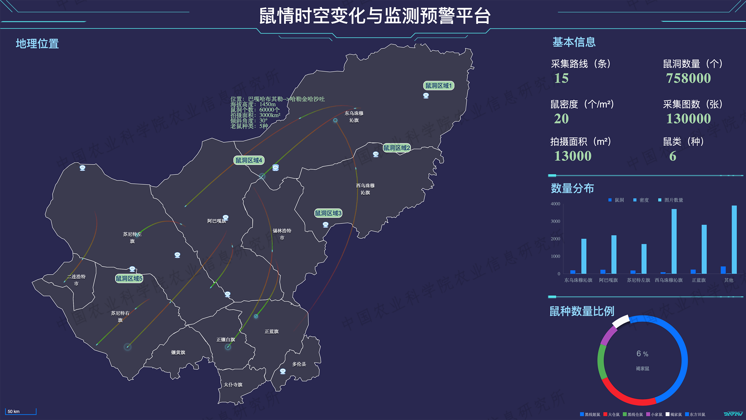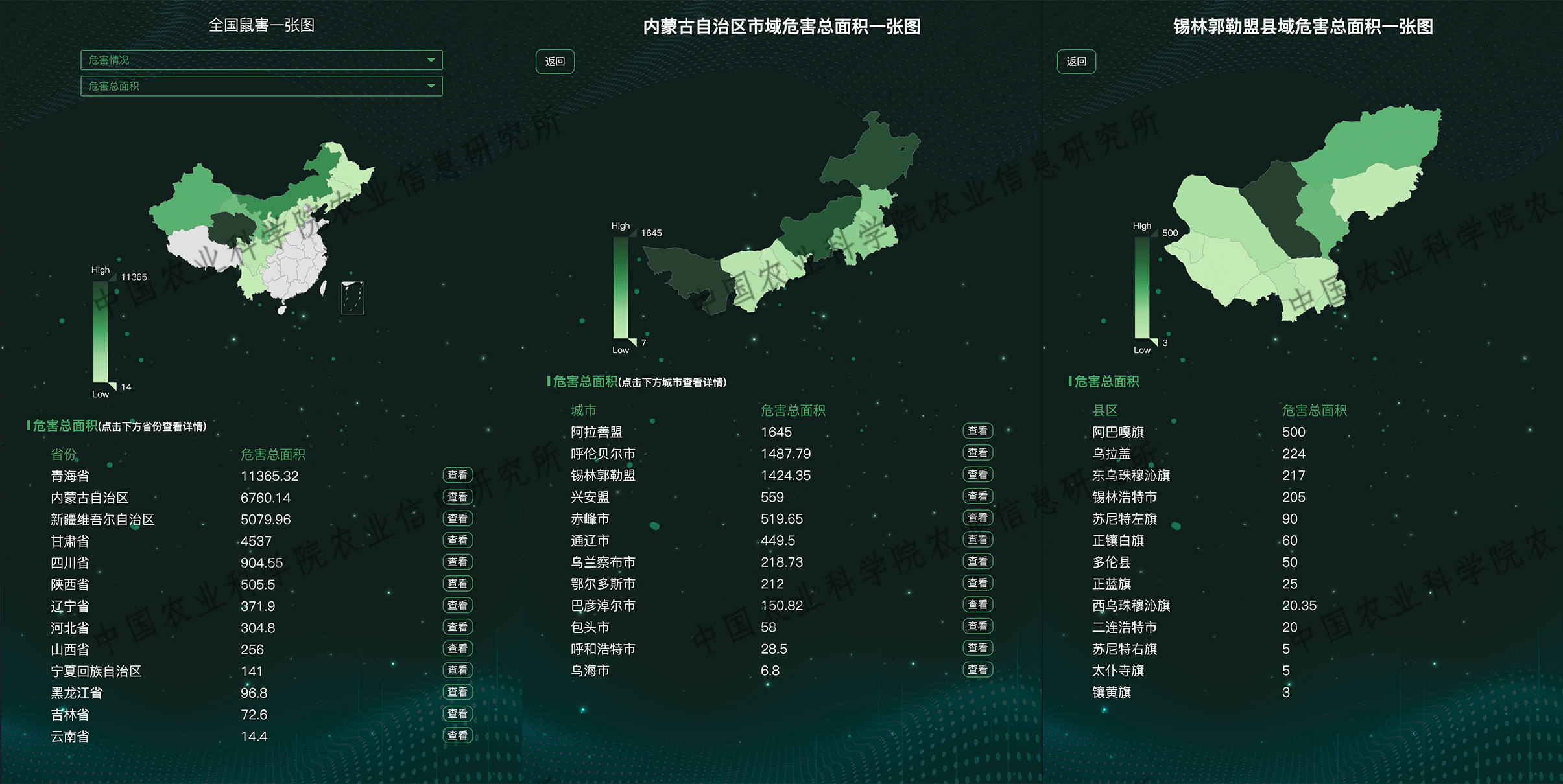 鼠情数据整合管理及可视化展示,提供“省-市-县-乡-牧场-设备点”的多级数据联动,数据实时滚动呈现,满足业务监控、风险预警、会议展览等需求。